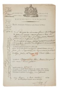 - Pièce imprimée avec en-tête vignette, indications manuscrites. SAIN Commissaire Ordonnateur près l’armée de l’ouest. 8 ventôse An 3 et signature autographe de SAIN. Apostille signée du représentant du peuple à l'armée de l’ouest BEZARD. (Paiement dépenses de cuir fournis à la 4eme compagnie de gendarmerie à cheval…)