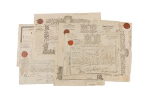 [REVOLUTION] Ensemble de 7 Congés Militaires (réforme, retraite, blessures) avec vignettes et encadrements décorés ou entièrement manuscrits faute d’imprimés le jour où ils ont été établis (bel état).
