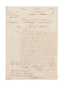 -Congé militaire (congé absolu) : 6ème bataillon du BEC D’AMBES Compagnie de Vernet, destiné à un volontaire dudit bataillon. Fait au camp D’ORTASSA, le 25 germinal an 2 (14 avril 1794). Nombreuses signatures dont la rare du Général DUGOMMIER qui mourra quelques mois plus tard (17 nov. 1794) sur la montagne noire par un obus qui lui fracassa la tête.
