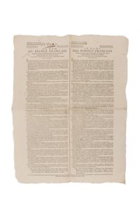 Affiche : Armée de ROME, avril 1798. Jugement (contumace) du chef de bataillon CHARRIER, employé à l'état-major du général CERVONI. Accusé d’avoir fait enlever avec force armée 2 caisses remplies d’argenterie, de bijoux, et autres effets précieux du palais appartenant au duc de GESSO à Monte Citorio. Condamné à la peine de mort. Dimensions : 43 x 57 cm.