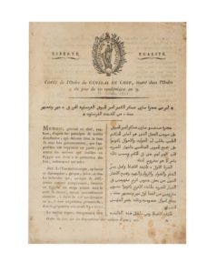 Pièce imprimée de 5 p. in-folio signée Menou et Estève avec ordre du jour en Français et en arabe sur les impositions des nations Copte, Syrienne, Grecque, Juive et Franque.