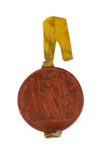 Cire rouge, ruban de soie jaune.