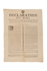 - Affiche : déclaration du ROI, 23 mai 1774 qui ordonne le changement des poinçons pour la fabrication des espèces sans que néanmoins le titre, le poids, et la valeur en soient changés. Enregistré en le cours des monnaies le 30 desdits mois et an. TB. Dimensions : 38 x 50 cm.