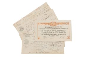 - 1 reçu de la Banque de France d’un versement en Or la somme de 200 Francs en échange de billets de banque, le 8 septembre 1915. Dimensions : 12,5 x 21,4 cm.