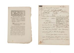 Réunion d’une lettre manuscrite de recommandation PARIS an 2, et d’un imprimé de 8 pages