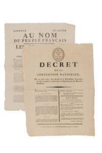 -Une affiche, au nom du peuple français les représentants du peuple près des armées d’Italie et des ALPES, RITTER et SALICETTI à Marseille le 15 nivôse an 3 (sur les cuirs et peau pour les besoins de l’armée), imprimerie P.A. FAVET. Dimensions : 36 x 45 cm.
