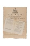 Condamnation à la peine de mort pour 11 individus, renvoie 2 individus à la maison de réclusion et acquittement de l’accusation et en élargit 5 autres. Imprimerie de Jouve Comp. Imprimeur du Tribunal Criminel Révolutionnaire. Manque bandeau de titre. Dimensions : 52 x 41 cm.