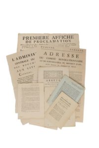 -Affiche « première affiche de confiscation des biens, meubles, immeubles des émigrés du territoire d’Aix 1793 (imprimerie Mouret Aix). Dimensions : 42 x 52 cm.