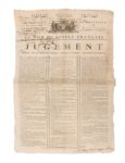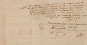 Très belle et rare affiche avec une superbe et grande vignette en entête du département du 13e division militaire, Armée d’ANGLETERRE. Quimper, octobre 1798. Accusé d’émigration, rentré en France clandestinement. Il est condamné à se retirer hors de France dans un pays étranger de son choix. Au verso de l’affiche : longue apostille autographe du chef de brigade BONTE, futur général d’Empire. Apostille signée de 4 membres de l’administration centrale du Finistère à QUIMPER. Dimensions : 45 x 67 cm.