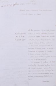 Mémoire pour la demande d’une sous-lieutenance dans les troupes à cheval. Mémoire rédigé et signé par Michel DUMANS, député du Maine à l'Assemblée Nationale pour son fils. Apostille autographe de recommandation au nom des députés de la province du MAINE rédigée et signée par Antoine CHOISEUL PRASLIN, DE HERCÉ, DELALANDE (Julien Joseph), LIVRÉ (Eustache), tous Francs-Maçons, autres députés : Cornilleau, Debailly de Fresnay, F. G .Evêque du Mans, Menard, Lepelletier curé de Domfront, Jouye (Des Roches), Lasnier de Vaussenay, Gournay, Chenou de Beaumont, et un autre à identifier. 15 signatures de députés à l'Assemblée Nationale.