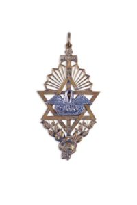 Important décor : 2 triangles entrelacés, rose, croix avec inscription INRI, pélican argenté.