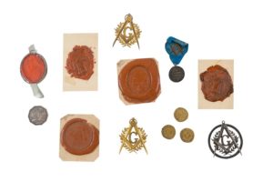 5 sceaux de cire rouge de Loges Maçonniques d’Aix en Provence, 3 bijoux maçonniques (2 dorés et un argenté), une médaille de la Loge « La Respectable Harmonie », 3 jetons dorés (Orient de Rueil) et un jeton octogonal argenté.