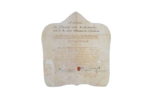 Diplôme sur vélin entièrement manuscrit à l’encre noire et ocre décerné par la loge “La Parfaite Union, fille de la Grande Respectable Loge de Clermont” au Frère CHÂTEAUNEUF reconnu comme Maître. Forme très originale, ses contours reprennent la forme d’un tablier Franc-Maçon.