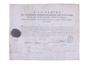 Diplôme destiné au Frère Gilbert PORTE reçu au grade d’Apprenti, diplôme rarement décerné. Imposante entête imprimé rare “A la gloire du Suprême Rémunérateur de l’Univers source de toute lumière, vérité et justice, dans un lieu très fort, très secret et très éclairé ou règnent la paix le silence et l’égalité », “les maîtres et officiers dignitaires assemblés sous l’autorité du souverain Grand Maître Louis Philippe D’ORLÉANS, Duc de Chartres, Prince du sang ».