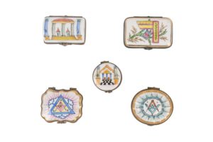 [FRANC-MAÇONNERIE] Ensemble de 5 boites en porcelaine à décors maçonniques peints, XXème …