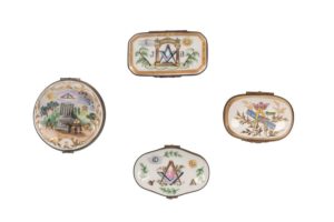 [FRANC-MAÇONNERIE] Ensemble de 4 boîtes en porcelaine à décors maçonniques peints, XXème siècle :