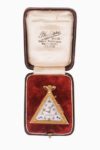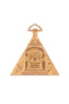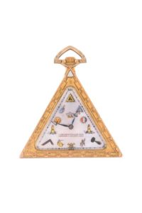 Montre de forme triangulaire à boîtier doré. Nombreuses ornementations maçonniques sur chaque face: lettre “G”, Temple, la chaire du Vénérable, divers outils, branches d’acacia, œil omniscient, chaîne d’union. Cadran nacré, orné de symboles maçonniques, au centre un pélican et la formule "Love Your Fellow Man, lend Him a Helping Hand”.