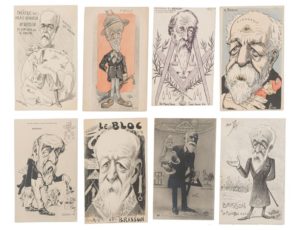 -Rare série de 8 cartes postales (à l'état neuf) de caricatures antimaçonniques concernant le frère Henri BRISSON (1835 - 1912), par ORENS, ROSTRO, ROSE...