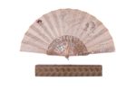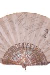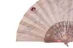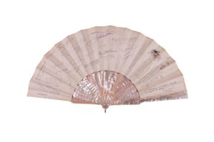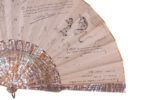 Eventail plié, la feuille double en peau avec de nombreuses dédicaces autographes et croquis de célébrités du monde de l’époque, disposés en pêle-mêle. Monture en nacre blanche gravée et dorée.