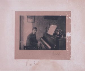 Beau portrait du compositeur assis devant son piano, jambes croisées et cigarette à la main (avec fac-similé de sa signature).