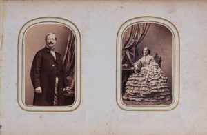 In-8 oblong à fermoirs relié chagrin marron, dos décollé. 60 portraits de personnages du second Empire au format carte de visite. On joint une boîte de 12 vues pour lanterne magique.