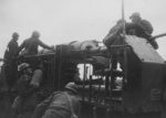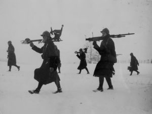 Tampon du “Syndicat de la Presse Parisienne” au verso et légendes tapuscrites, “Petit Parisien”, “Excelsior”, “le Miroir” : chars, unité de chars arrivant dans un village, cantonnement d’artillerie, groupe de pionniers au travail, section de mitrailleuses de chasseurs alpins, motocyclistes de liaison, batterie de 75mm, chèvre mascotte, camp de prisonniers allemands, musicien brancardier, cagna sous la neige, corvée de soupe, extérieur d’araba colombophiles, le colombophile siffle la rentrée des pigeons….