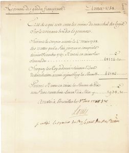 cOMPtes Du régiMent Des garDes FrançOises, pour l’année 1758, du reliquat entre les mains du maréchal des logis, « sur le revenant bon des logemens » ; il reste en caisse la somme de 1938 livres 10 sols. Le maréchal Louis-Antoine de Gontaut, duc de BirOn certifie la signature du Roi.