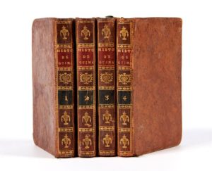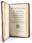ALEMAN (Mateo) - Histoire de Guzman d’Alfarache, nouvellement traduite, et purgée des moralités superflues par Le Sage - Lille ; C. F. J. Lehoucq, [vers 1790] - 4 volumes In-18° - 1 pâle auréole à quelques feuillets dans 2 volumes - Reliure de l’époque basane fauve mouchetée (quelques coins frottés) - Dos lisses ornés - Pièces de titre et de tomaison maroquin bordeaux et brunes - Tranches beiges mouchetées de rouge - Bon exemplaire.