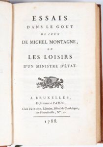 [ARGENSON (René Louis de Voyer de Paulmy, marquis d')] - Essais dans le gout de ceux de Michel Montagne, ou les Loisirs d'un Ministre d'État - Bruxelles, Paris ; Buisson, 1788 - 1 volume In-8° - Reliure de l’époque basane havane mouchetée (légères petites épidermures aux plats) - Dos lisse orné (passé uniformément) - Pièce de titre maroquin bordeaux - Tranches jaunes - Bon exemplaire.