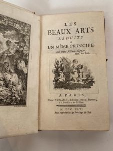[BEAUX-ARTS] - [BATTEUX (Charles)] - Les Beaux-Arts réduits à un même principe - Paris ; Durand, 1746 - 1 volume In-12° - Frontispice gravé (détaché) et jolie vignette au titre signés C. Eisen - Reliure de l’époque basane fauve marbrée (plats épidermés avec manques de cuir et galerie de ver au 1er plat, 2 coins émoussés) - Dos à nerfs orné (épidermures et petits manques) - Pièce de titre maroquin bordeaux (petit manque) - Tranches mouchetées de rouge.