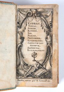 [BIBLIA] - [Biblia Sacra] - Esdras, Tobias, Judith, Esther, Job, Psalmi, Proverbia, Ecclesisastes, Canticum canticorum, Sapienta. Ecclesisticus - Parisiis ; Fr. Leonard, 1670 - 1 volume petit In-12° (12x6,80 cm) - Titre gravé (quasi détaché, restauré au verso) - Reliure de l’époque vélin crème (tache au 2nd plat, dernière garde manquante) - Dos à nerfs titré et orné à l’encre noire.