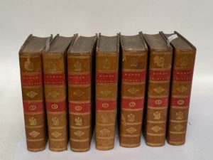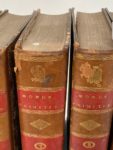 COURT DE GEBELIN (Antoine) - Monde primitif analysé et comparé avec le monde moderne ou recherches sur les antiquités du monde - Paris ; L’auteur, Boudet, Valleyre l’aîné, Saugrain, Ruault, puis l’auteur, Valleyre et Sorin, 1773-1782 - 9 volumes In-4° - L’ouvrage se compose de plusieurs titres avec leurs pages de titre ou faux titres respectifs : Tome I : Plan général et raisonné. Allégories orientales [...]. Le Monde primitif [...] considéré dans son génie allégorique […] - Tome II : Le Monde primitif [...] considéré dans l'Histoire naturelle de la Parole ou Origine du langage et de l'écriture - Tome III : Le Monde primitif [...] considéré dans l'Histoire naturelle de la Parole ou Grammaire universelle et comparative - Tome IV : Le Monde primitif [...] considéré dans l'Histoire civile, religieuse et allégorique du calendrier ou almanach - Tome V : Le Monde primitif [...] considéré dans les origines grecques ou Dictionnaire étymologique de la langue grecque - Tome VI : Le Monde primitif [...] considéré dans les origines latines ou Dictionnaire étymologique de la langue latine (1ère partie) - Tome VII : Le Monde primitif [...] considéré dans les origines latines ou Dictionnaire étymologique de la langue latine (2ème partie) - Tome VIII : Le Monde primitif [...] considéré dans les origines françaises ou Dictionnaire étymologique de la langue française - Tome IX : Le Monde primitif [...] considéré dans divers objets concernant l'Histoire, le Blason, les Monnaies, les Jeux, les Voyages des Phéniciens autour du Monde, les Langues Américaines, etc. ou Dissertations mêlées (tome I seul, le 2nd jamais paru) - Petite galerie de ver se terminant en trou de tête d’épingle en marge interne des 14 premiers feuillets du tome I, 1 forte auréole avec quelques petites moisissures in fine au tome III, auréole en marge supérieure de quelques feuillets au tome V, 1 autre en marge supérieure au tome VII, quelques feuillets jaunis - 4 frontispices gravés (sur 5), 11 bandeaux (dont 6 par Marillier), 44 planches dont 20 dépliantes et 2 grandes cartes dépliantes en frontispice - Reliure uniforme début XIXe siècle demi basane fauve (de menues épidermures aux papiers des plats) - Dos lisses ornés de fleurons et aigles dorés (de rares épidermures) - Pièces de titre et de tomaison maroquin bordeaux - Tranches mouchetées de rouge - Bon exemplaire en rare édition originale de ce monumental ouvrage resté inachevé, axé sur la mythologie et la recherche d'une langue universelle, par le protestant, franc-maçon et physiocrate Court de Gébelin.