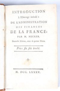 [ÉCONOMIE POLITIQUE] - [BLONDEL (Jean)] - Introduction à l'ouvrage intitulé : De l'Administration des finances de la France ; par M. Necker. Nouvelle édition, avec de petites notes - Sans lieu ; Sans nom, 1785 - 1 volume In-8° - Quelques rares rousseurs éparses - Reliure de l’époque veau havane moucheté - Dos lisse orné (uniformément passé, 1 petit accroc transversal) - Pièce de titre maroquin bordeaux - Tranches jaunes - Ex-libris contre collé au 1er contre plat : Château de Loyat. Réfutation parue en même temps que le célèbre ouvrage de Necker, Blondel condamne l'abolition des corvées, des impôts sur le luxe et de la publication des comptes.