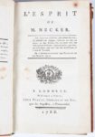 [ÉCONOMIE POLITIQUE] - [PINOT-DUCLOS (Charles)] - L'Esprit de M. Necker - Londres, Paris ; Prault, 1788 - 1 volume In-8° - Quelques petites rousseurs éparses, quelques feuillets jaunis - 9 tableaux dépliants - Reliure de l’époque veau fauve moucheté - Dos lisse orné (1 petit accroc) - Pièce de titre maroquin havane - Tranches jaunes - Bon exemplaire en édition originale.