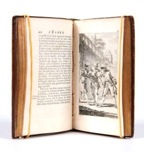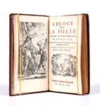 ÉRASME - L’éloge de la folie, traduit du latin d’Érasme par M. de Guedeville. Nouvelle édition revûe & corrigée sur le Texte de l'Edition de Bâle, et ornée de nouvelles figures, avec des notes - Sans lieu ; Sans nom, 1752 - 1 volume In-12° - Frontispice, vignette au titre à l’encre rouge et noire, bandeau, 13 figures hors texte et 1 cul-de-lampe par Eisen - Reliure de l’époque veau havane marbré - Plats encadrés d’1 triple filet doré - Dos lisse orné - Pièce de titre maroquin bordeaux - Tranches dorées - Bon exemplaire.