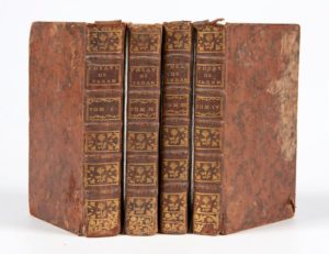 FAGAN (Barthélemy-Christophe) - Théâtre et autres œuvres du mesme auteur - Paris ; N. R. Duchesne, 1760 - 4 volumes In-12° - Frontispice gravé d’après Durand, jolies vignettes différentes à chaque titre à l’encre rouge et noire - Reliure de l’époque veau havane marbré (quelques rares épidermures et petits manques aux plats, quelques coins émoussés, très petits débuts de fente à 2 mors) - Dos à nerfs ornés (des coiffes accidentées, 2 arasées) - Pièces de titre et de tomaison maroquin brun - Tranches rouges - Bon exemplaire en 1ère édition collective.