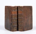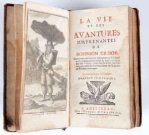 [FOE (Daniel de)] - La vie et les avantures surprenantes de Robinson Crusoé […] - Traduit de l’Anglois - Amsterdam ; L’Honoré & Chatelain, 1720 - 2 volumes In-12° (sur 3, ici les 2 premiers tomes) - Des auréoles, des déchirures, parfois avec petit manque (1 feuillet avec perte de texte minime) - 2 frontispices gravés, et 10 planches hors texte (planche de mappemonde dépliante manquante) - Reliure de l’époque veau brun granité (début de fentes aux mors, coins émoussés) - Dos à nerfs ornés (coiffes arasées) - Pièces de titre maroquin fauve - Tranches mouchetées de rouge - Édition originale en français de la première partie - Vendu en l’état.