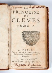 [LAFAYETTE (Madame de)] - La Princesse de Clèves - Paris ; Claude Barbin, 1678 - 4 tomes en 1 volume In-12° - [4], 78, [1 blanc] feuillet, 76, 79, [1 blanche], 79, [1 blanche] pages - Des petites rousseurs et auréoles éparses, feuillets jaunis, petit manque marginale au feuillet des pages 39-40 - Reliure de l’époque basane havane (plats frottés et épidermés, quelques petits trous aux plats, 1 accroc en haut du 1er mors, coins émoussés, 1ère garde quasi-détachée) - Dos à nerfs orné et titré or (coiffe supérieure arasée, nerfs frottés) - Ex-libris manuscrit ancien répété au 1er titre : Chaparon de Restoro - Rare contrefaçon en date de l’édition originale.