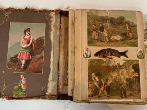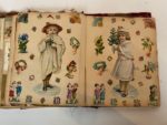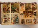 [CHROMOLITHOGRAPHIES] - Collection de chromolithographies XIXe siècle contre collées sur 66 pages de papier fort dans 1 album In-4° - Scènes enfantines, mode, diverses cartes publicitaires dont Chocolat Poulain, alcool de menthe Riqlès, personnages caricaturaux, scènes historiques, motifs floraux, etc. - 1 page avec portrait de jeune fille au crayon - En feuilles in fine : 9 cartes Disney en couleurs pour le savon Cadum - Reliure de l’époque cartonnage doublé de velours (très usagée, feuillets majoritairement détachés) - Bon état des chromos - Vendu en l’état.