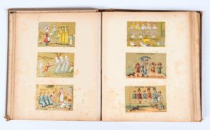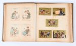 [CHROMOLITHOGRAPHIES] - Collection de cartes publicitaires en chromolithographie contrecollées sur 44 pages dans 1 album grand In-4° représentant des scènes enfantines pour des commerces bordelaix (Librairie Duthu, Au Louvre, Maison Modèle Victor Rouzaud & Rafaillac, Elixir dentifrice de l’Abbaye de Soulac, Émile Marchand, etc. ) - Contrecollées sur papier fort (rousseurs à ce dernier) - Reliure de l’époque cartonnage toilé orné d’1 décor rouge, noir et or (usagée et corps de l’ouvrage détaché) - Bel état des chromos.