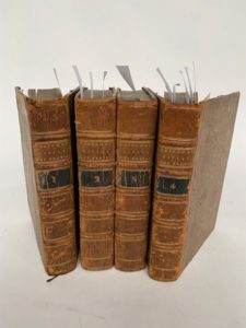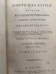 [COSTUMES - MODE] - MARÉCHAL (Sylvain) - Costumes civils actuels de tous les peuples connus, dessinés d’après nature, gavés et coloriés, accompagnés d’une notice […] - Paris ; Deterville, [vers 1898] - 4 volumes In-8° - Petites rousseurs éparses, quelques manques marginaux, dernière garde blanche du tome I déchirée avec manque - 293 planches gravées (sur 298) sur cuivre d'après les dessins de Grasset de Saint-Sauveur représentant les costumes civils des différents peuples des 5 continents, toutes rehaussées en coloris d’époque (1 planche trouée avec petit manque) - Reliure de l’époque demi-basane fauve (quelques mors frottés, 2 coins émoussés, 2nd plat du tome I épidermé, des parties de coupes usées) - Dos à nerfs ornés (des griffures, 3 coiffes accidentées) - Mention manuscrite à la 1ère garde blanche : « Cet ouvrage me provient de la bibliothèque de mon excellent père ; je le donne à mon excellent fils Francisque Habasque, président honoraire à la cour de Bordeaux. Bordeaux le 11 janvier 1904 » - 2nde édition de ce bel ouvrage dont l'originale parut en 1784.