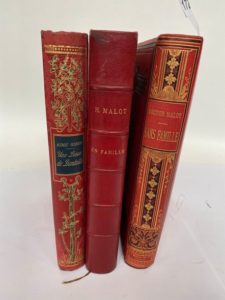 Ensemble de 3 volumes In-4° : MALOT (Hector) - Sans famille - Paris ; J. Hetzel et Cie, sans date - Dessins in et hors texte par E. Bayard - Reliure éditeur signée Engel cartonnage toilé rouge richement orné or - DU MÊME - En famille - Paris ; Ernest Flammarion, sans date - Illustrations in et hors texte de Lanos - Reliure de l’époque demi-chagrin bordeaux - Dos à nerfs titré or - Tête dorée - GIRON (Aimé) - Une lieue de dentelle - Paris ; Librairie Hachette et Cie, 1894 - Illustrations in et hors de Laurent-Desrousseaux - Reliure éditeur cartonnage toilé rouge orné d’1 décor polychrome et or aux 2 plats - Dos orné et titré or à l’identique - Tranches dorées - Très bons exemplaires.