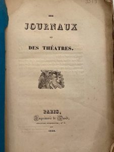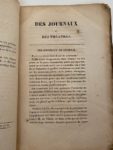 [LIBERTÉ D’EXPRESSION] - [LEPOITEVIN (Auguste, dit de L’Égreville)] - Des journaux et des théâtres - Paris ; Imprimerie de David, 1828 - 1 plaquette In-8° brochée non coupée sous couverture d’attente bleue annotée au 1er plat (dos à vif) - 32 pages - Auréoles marginales - Édition originale par l’1 des fondateurs du journal Le Figaro.