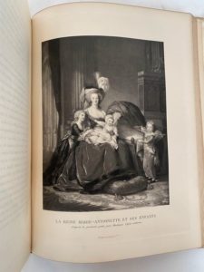 NOLHAC (Pierre de) - La Reine Marie-Antoinette - Paris ; Boussod, Valadon et Cie, 1890 - 1 volume In-4° - 1 petite tache d’encre en haut des contre plats, des 27 premiers et 4 derniers feuillets - Frontispice couleurs, 28 planches gravées hors texte - Reliure de l’époque chagrin cerise repoussé (de menus frottements et auréoles sombres aux plats) - Triple filets d’encadrement aux plats, fleurs de lys angulaires, armes centrales dorées - Dentelle intérieure - Dos à nerfs orné de fleurs de lys, titré et daté or - Tranches dorées - Joli ex-libris gravé au 1er contre plat : Bibliothèque de Brouchetière - On y joint : le bon de souscription en feuilles de 4 pages (contours déchirés) comprenant 1 planche gravée - Assez bon exemplaire aux armes de France et d’Autriche.