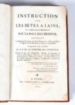 [OVICULTURE] - TESSIER (Alexandre Henri) - Instruction sur les bêtes à laine, et particulièrement sur la race des mérinos, contenant la manière de former de bons troupeaux, de les multiplier et soigner convenablement en santé et en maladie - Paris ; Imprimerie Impériale, 1810 - 1 volume In-8° - De petites rousseurs localisées aux planches - 6 planches gravées (1 déchirée sans manque) et 1 tableau dépliants - Reliure de l’époque brune (1er plat rayé, mors frotté) - Dos lisse orné (passé uniformément) - Pièce de titre maroquin orange - Bon exemplaire en 1ère édition.