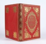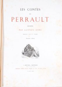 PERRAULT (Charles) - Les contes de Perrault - Paris ; J. Hetzel et Cie, 1863 - 1 volume In-folio - Des rousseurs - 40 planches hors texte sur fond teinté montées sur onglet par Gustave Doré gravées en noir - Reliure éditeur percale vieux rose signée Engel (petite décoloration de la toile en bas du 2nd plat) - Plats encadrés d’1 large filet et richement ornés de motifs dorés et titre central dans médaillon au 1er plat - Dos lisse titré et orné de médaillons dorés (coiffe supérieure légèrement élimée) - Bon exemplaire (hormis les rousseurs) en 3ème édition.