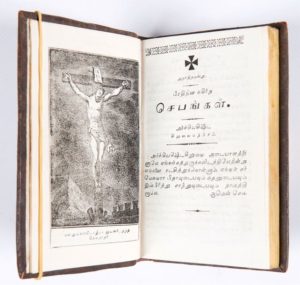 [RELIGIOSA] - Livre de prière chrétien en écriture tamoule vers 1820 - 1 volume In-12° - Frontispice gravé 3 gravures hors texte - Reliure de l’époque basane havane marbrée - Dos lisse orné de filets dorés et à froid - Pièce de titre maroquin cerise - Tranches jaunes - Bon exemplaire