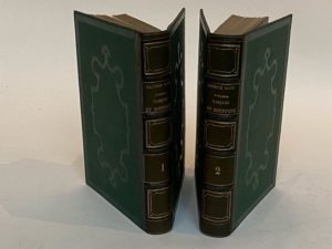SAND (Maurice) - Masques et bouffons (Comédie italienne) - Paris ; Michel Lévy, 1860 - 2 volumes In-4° - Des rousseurs éparses, plus prononcées au tome I - Préface de George Sand et 50 belles gravures coloriées à la main de personnages de la Commedia dell’arte que l’on doit à Alexandre Manceau, l’amant de George Sand, d’après les dessins de l’auteur - Reliure de l’époque demi-chagrin vert sapin - Dos à nerfs ornés, titrés et tomés or (uniformément assombris) - Bon exemplaire en édition originale.