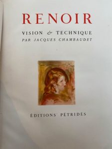 [BEAUX-ARTS] - CHAMBAUDET (Jacques) - Renoir. Vision et technique - Sans lieu ; Éditions Pétridès, 1947 - 1 volume grand In-4° en feuilles sous couverture rempliée, chemise beige titrée en long au dos et emboîtage beige illustré aux 2 plats (fentes partielles avec papier adhésif) - Couverture illustrée couleurs au 1er plat vignette couleurs au titre, et reproductions d’œuvres de Renoir en couleurs dont 4 planches hors texte tirées à la presse à bras - Très bon exemplaire numéroté sur pur chiffon de Montval (n°288 sur 300 de tirage total).