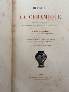 DOCUMENTATION - CÉRAMIQUE] - JACQUEMART (Albert) - Histoire de la céramique. Étude descriptive et raisonnée des poteries de tous les temps et de tous les peuples - Paris ; Librairie Hachette et Cie, 1873 - 1 volume grand In-4° - Rousseurs - 200 figures sur bois, 12 planches gravées à l’eau-forte Jules Jacquemart et 100 marques et monogrammes - Reliure de l’époque demi-chagrin bleu nuit - Dos à nerfs titré or - Tête dorée.